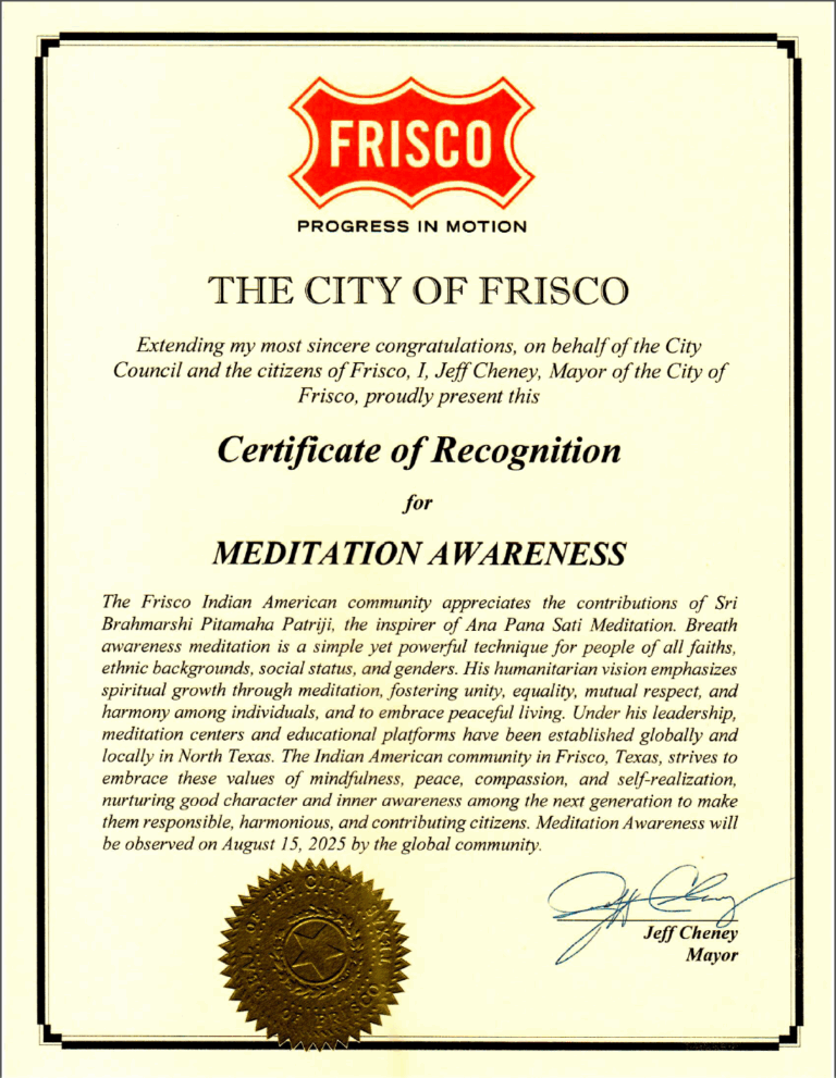 Proclamation from the City of Frisco — Declaring August 15th, 2025 as Meditation Awareness Day.