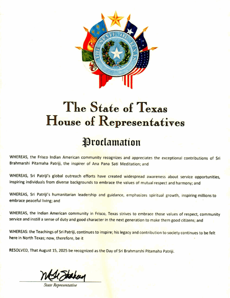 Proclamation from the Texas State Government— Honoring Brahmarshi Pitamaha Patriji Day.