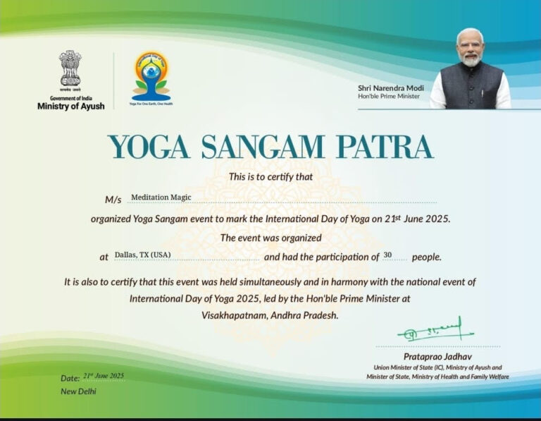 Yoga Sangam Patra (2025) — Awarded on the occasion of International Yoga Day by the Ministry of Ayush, Government of India, under the presidency of Shri Narendra Modi.