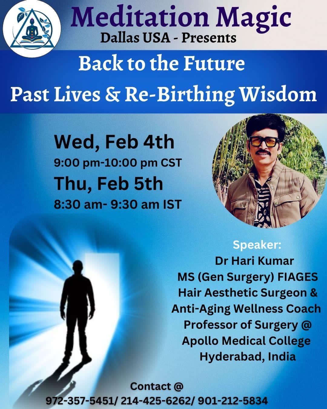 Meditation Magic Dallas, USA invites you for a special session on Back to the Future on Past Lives & Re-Birthing Wisdom by Dr Hari Kumar, MS (Gen Surgery) FIAGES, Hair Aesthetic Surgeon & Anta AI-Aging Wellness Coach, Professor of Surgery @ Apollo Medical College Hyderabad, India